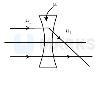 The refractive index of the material of a concave lens is $\mu$. It is immersed in a medium of refractive index $\mu_1$. A parallel beam of light is incident on the lens. The path of the emergent rays when $\mu_1>\mu$ is: