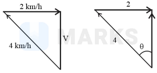 To reach the point directly opposite to the starting point, the resultant velocity of swimmer should be as shown in figure.