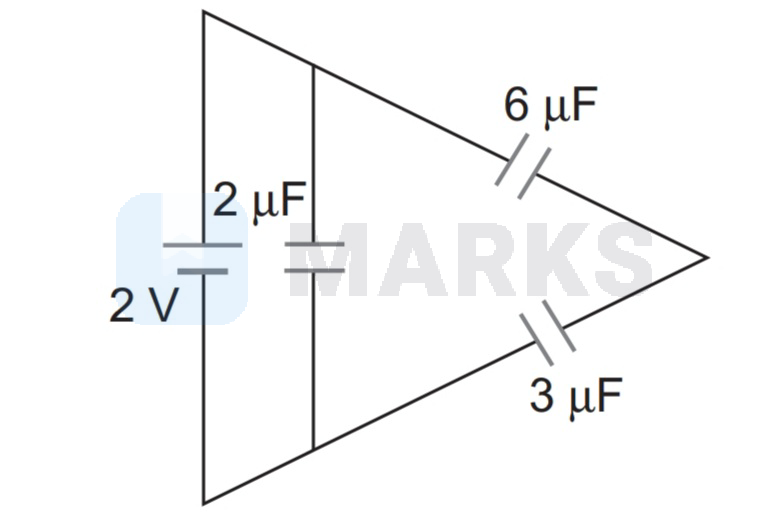 $6 \mu \mathrm{F}$ and $3 \mu \mathrm{F}$ capacitors are in series