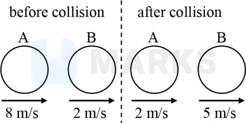 The two diagrams show the situation before and after a collision between two spheres and of equal radii moving along the same straight line on a smooth horizontal surface. The coefficient of restitution is