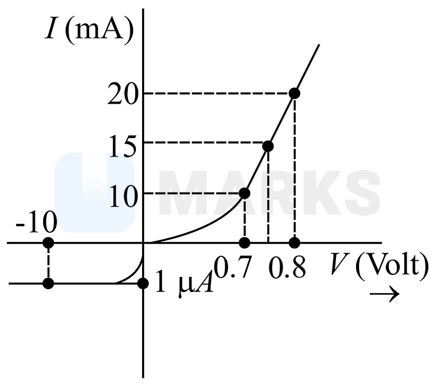 The characteristic of a diode is shown in the figure. The ratio of forward to reverse bias resistance is: