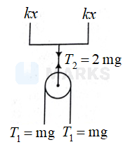 There are two identical springs each of spring constant . Here springs, pulley and rods are massless and the block has mass . What is the extension of each spring at equilibrium?