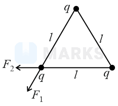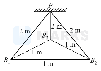 Three identical charged balls each of charge are suspended from a common point by silk threads of each (as shown in figure). They form an equilateral triangle of side .