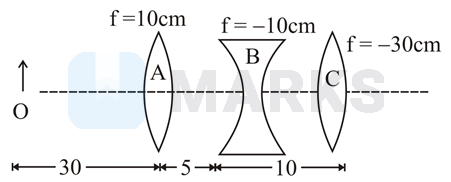 Three lenses of focal lengths and are placed at a distance of and respectively from an object. The distance between the object and the image formed is