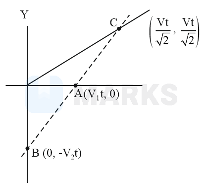 Three particles start from the origin at the same time, one with a velocity along the -axis, second along the negative -axis with a velocity and third particle moves along the line . The velocity of third particle, so that three may always lie on the same line is :
