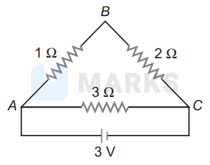 Three resistors $1 \Omega, 2 \Omega$ and $3 \Omega$ are connected to form a triangle. Across $3 \Omega$ resistor a $3 \mathrm{~V}$ battery is connected. The current through $3 \Omega$ resistor is