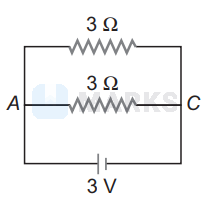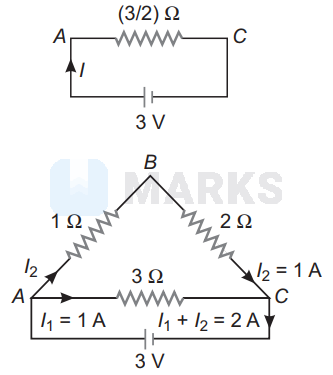 $\therefore$ Current in $3 \Omega$ resistor $=\frac{\mathrm{I}}{2}=1 \mathrm{~A}$