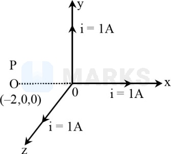 Three semi-infinite wires, each carrying a current of are placed on each of the coordinate axes with their ends at the origin, as shown in the figure. The magnetic induction at point is