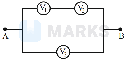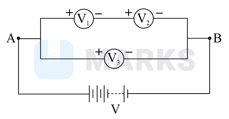 Three voltmeters, all having different internal resistances are joined as shown in figure. When some potential difference is applied across and , their readings are and . Choose the correct option.