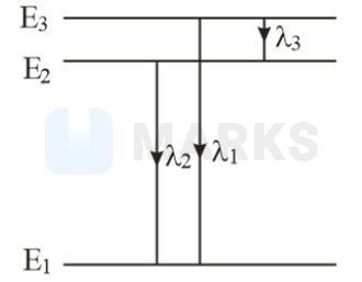 Let the three energy levels be , and . The wavelength and of the spectra lines corresponding to the three energy transitions are depicted as shown in figure.
