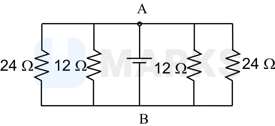 Two circular rings of identical radii and resistance are placed as shown in the figure. Conducting joints are made at points and and a cell of emf is connected between these two points. What is the power (in ) delivered by the cell? [ and are the centres of the two rings]