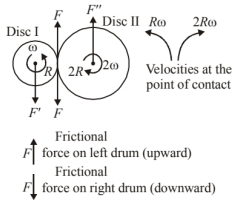 Two cylindrical hollow drums of radii $R$ and $2 R$, and of a common height $h$, are rotating with angular velocities $\omega$ (anti-clockwise) and $\omega^{\prime}$ (clockwise), respectively. Their axes, fixed are parallel and in a horizontal plane separated by $3 R+\delta$. They are now brought in contact $(\delta \rightarrow 0)$