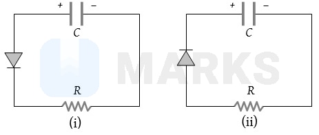 In figure (i) PN junction diode is in forward bias, so current will flow in the circuit i.e., charge on the capacitor decrease and in time t it becomes ; where