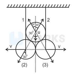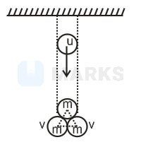 Two identical spheres, each of mass are suspended by vertical strings such that they are in contact with their centres at the same level. A third identical sphere strikes the other two spheres simultaneously with a velocity such that the centres of the spheres at the instant of impact form an equilateral triangle in a vertical plane. If the collision is perfectly elastic, then the combined impulse due to the strings is