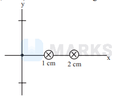 Two infinitely long thin wires are placed at $(1 \mathrm{~cm}, 0 \mathrm{~cm})$ and $(2 \mathrm{~cm}, 0 \mathrm{~cm})$ as shown in the figure.