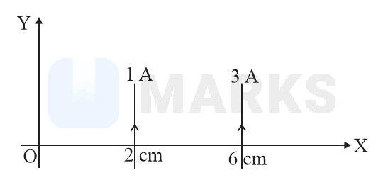 Two long parallel conductors are placed at right angles to a metre scale at the and marks as shown in the figure