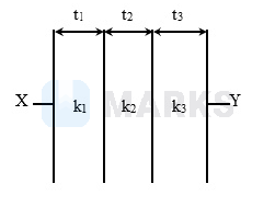 & \mathrm{C}=\frac{\mathrm{A} \varepsilon_0}{\left[\frac{\mathrm{t}_1}{\mathrm{k}_1}+\frac{\mathrm{t}_2}{\mathrm{k}_2}+\frac{\mathrm{t}_3}{\mathrm{k}_3}\right]}