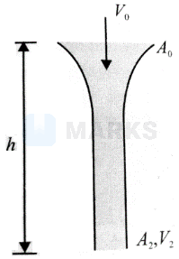 Water from a tap emerges vertically downwards with an initial velocity . Assuming pressure is constant throughout the stream of water and the flow is steady, find the distance from the tap at which cross-sectional area of the stream is half of the cross-sectional area of the stream at the tap.