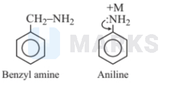 Benzyl amine is more basic than aniline because the benzyl group is an electron-donating group on account of the + I effect. So, it is capable of increasing the electron density of $\mathrm{N}$ of the $-\mathrm{NH}_2$ group. Thus, because of the higher electron density, the rate of donation of a free pair of electrons is increased, i.e., the basic character is higher. Phenyl and nitro groups are electron attractive groups, so they are able to decrease the electron density of $\mathrm{N}$ of $-\mathrm{NH}_2$ group. Hence, they are less basic than aniline.