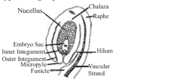 A typical angiospermic ovule is a small structure which is formed in the ovary. Ovule first develops as a projection on the placenta and composed of multilayered cellular tissue called the nucellus. The hypodermal cell of the nucellus enlarges and transformed into megaspore mother cell. This cell undergoes meiosis to produce four haploid cells only one of which develops \& forms embryo sac (female gametophyte). An ovule may be surrounded by one or two protective layers called integuments, leaving a small opening at one end termed as micropyle which acts as passage for the entry of the pollen tube into the ovule. Thus, a typical ovule consists of a fully developed embryo sac with the nucellus and integuments.